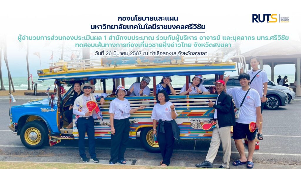 เมื่อวันที่ 26 มีนาคม 2567 ผู้อำนวยการส่วนกองประเมินผล 1 สำนักงบประมาณ ร่วมกับผู้บริหาร อาจารย์ และบุคลากร มทร.ศรีวิชัย ทดสอบเส้นทางการท่องเที่ยวชายฝั่งอ่าวไทย จังหวัดสงขลา