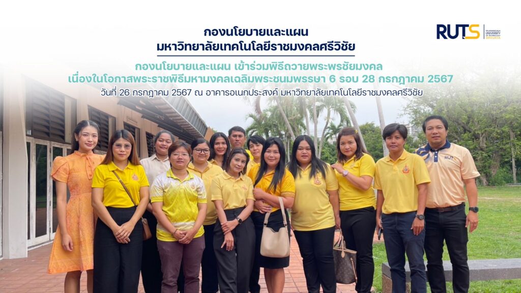 วันศุกร์ที่ 26 พฤษภาคม 2567 เวลา 08.00 น. บุคลากร กองนโยบายและแผน เข้าร่วมพิธีถวายพระพรชัยมงคลพระบาทสมเด็จพระเจ้าอยู่หัว เนื่องในโอกาสพระราชพิธีมหามงคลเฉลิมพระชนมพรรษา 6 รอบ 28 กรกฎาคม 2567 ณ อาคารอเนกประสงค์ มหาวิทยาลัยเทคโนโลยีราชมงคลศรีวิชัย