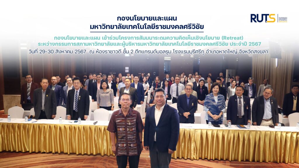 วันที่ 29 – 30 สิงหาคม 2567 ผู้อำนวยการกองนโยบายและแผน เข้าร่วมโครงการสัมมนาระดมความคิดเห็นเชิงนโยบาย (Retreat) ระหว่างกรรมการสภามหาวิทยาลัยและผู้บริหารมหาวิทยาลัยเทคโนโลยีราชมงคลศรีวิชัย ณ ห้องราชาวดี ชั้น 2 ตึกแกรนด์บอลรูม โรงแรมบุรีศรีภู อำเภอหาดใหญ่จังหวัดสงขลา