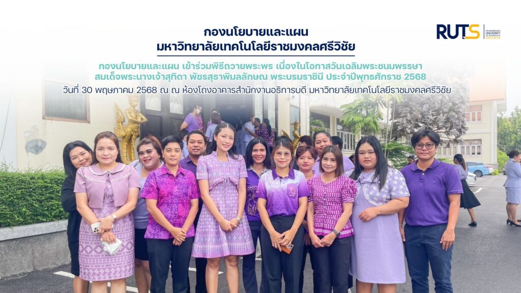 วันพฤหัสบดีที่ 30 พฤษภาคม พ.ศ. 2568 บุคลากรกองนโยบายและแผน เข้าร่วมพิธีถวายพระพรชัยมงคล สมเด็จพระนางเจ้าสุทิดา พัชรสุธาพิมลลักษณ พระบรมราชินี เนื่องในโอกาสวันเฉลิมพระชนมพรรษา วันที่ 3 มิถุนายน พ.ศ. 2568 เพื่อแสดงออกถึงความจงรักภักดี และแสดงความสำนึกในพระกรุณาธิคุณ ณ อาคารสำนักงานอธิการบดี มหาวิทยาลัยเทคโนโลยีราชมงคลศรีวิชัย สงขลา