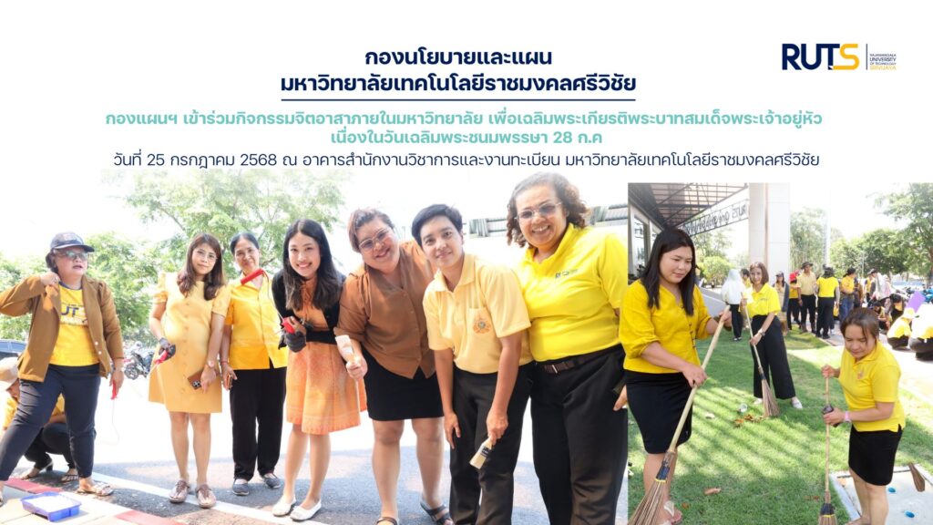 วันที่ 25 กรกฎาคม 2568 เวลา 14.00 น. บุคลากรกองนโยบายและแผน เข้าร่วมกิจกรรมจิตอาสาพัฒนาเก็บขยะ ทาสี ภายในมหาวิทยาลัยเพื่อเฉลิมพระเกียรติพระบาทสมเด็จพระเจ้าอยู่หัว เนื่องในโอกาสมหามงคลเฉลิมพระชนมพรรษา 7 รอบ 28 กรกฎาคม 2568 ณ บริเวณอาคารสำนักงานส่งเสริมวิชาการและงานทะเบียน มหาวิทยาลัยเทคโนโลยีราชมงคลศรีวิชัย สงขลา