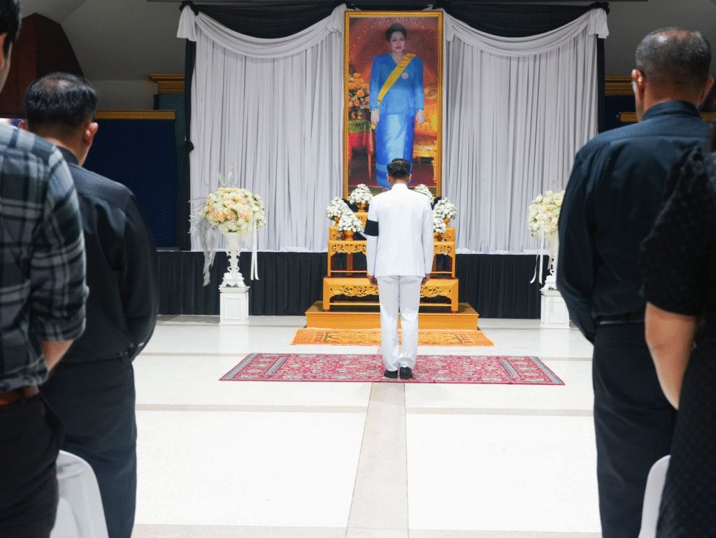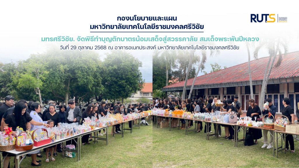 วันที่ 29 ตุลาคม 2568 ที่บริเวณอาคารอเนกประสงค์ มหาวิทยาลัยเทคโนโลยีราชมงคลศรีวิชัย นายสถาพร ขุนเพชร รองอธิการบดี เป็นประธานพิธี นำผู้บริหาร บุคลากร รวมถึงนักศึกษาต่างพร้อมใจแต่งกายในชุดสีดำเข้าร่วมพิธีทำบุญตักบาตรเพื่อถวายเป็นพระราชกุศล ภายในพิธีมีการนิมนต์พระสงฆ์ จำนวน 10 รูป จุดธูปเทียนบูชาพระรัตนไตร อาราธนาศีล สมาทานศีล และร่วมยืนสงบนิ่ง 93 นาที ถวายความอาลัยแด่สมเด็จพระนางเจ้าสิริกิติ์ พระบรมราชินีนาถ พระบรมราชชนนีพันปีหลวง โดยมีกองนโยบายและแผน เข้าร่วมพิธีในครั้งนี้อย่างพร้อมเพรียงกัน