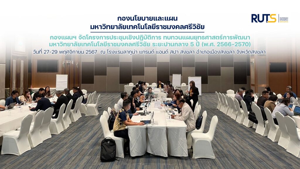 From November 27-29, 2024, the Policy and Planning Division organized a workshop to review the 5-Year Medium-Term Development Strategy Plan of Rajamangala University of Technology Srivijaya (2023-2027) at the Laguna Grand & Spa Hotel, Songkhla, Muang Songkhla District, Songkhla Province. The workshop was led by Assistant Professor Udon Namsen, Vice President, who opened the event, and Ms. Wanpen Chittapong, Director of the Policy and Planning Division, who explained the objectives of the project as follows: